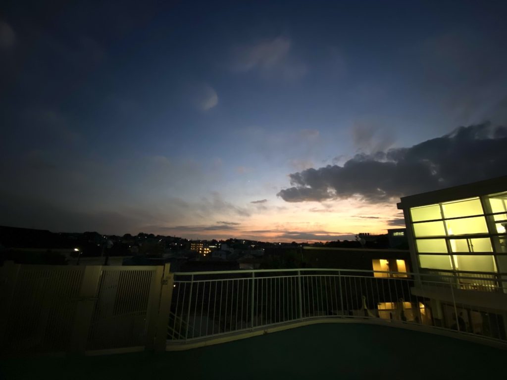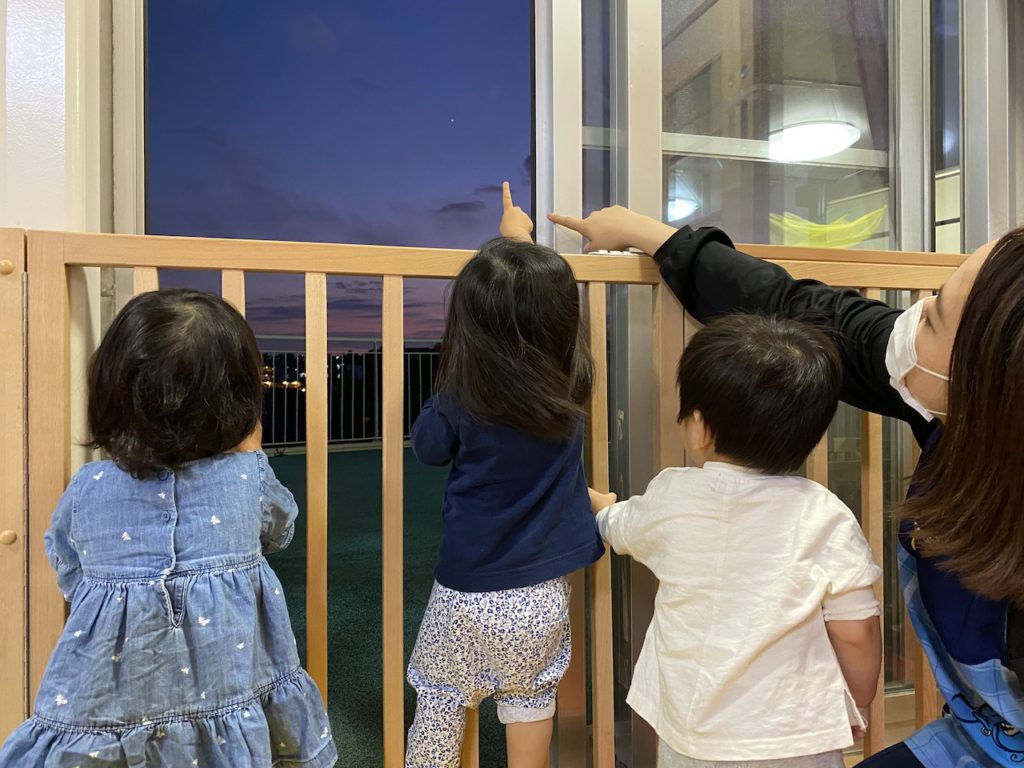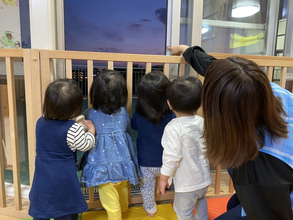 そんな中、0歳児のお部屋で、子ども達が夕焼けを眺めていました。