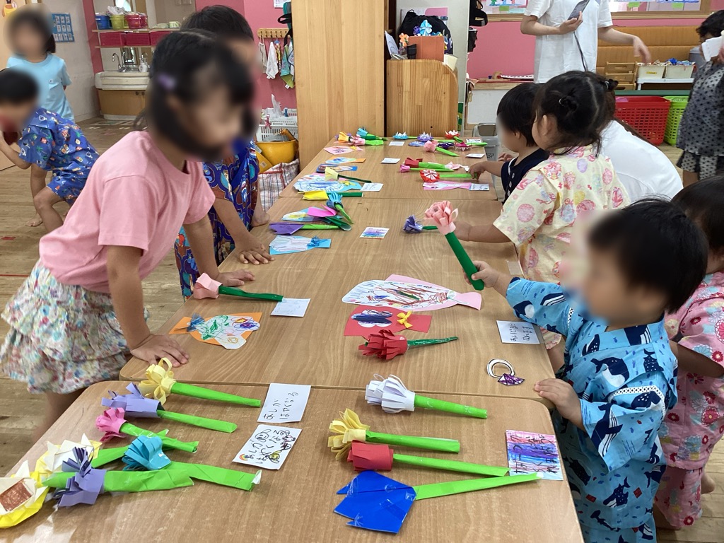 それぞれが好きなお店にいって、お土産もたくさん持って帰り、おうちの人に縁日での楽しかった出来事を寝るまでお話していたお友達もいたようです。まだまだ暑い日が続きますが、楽しくすごしていきたいと思います♪