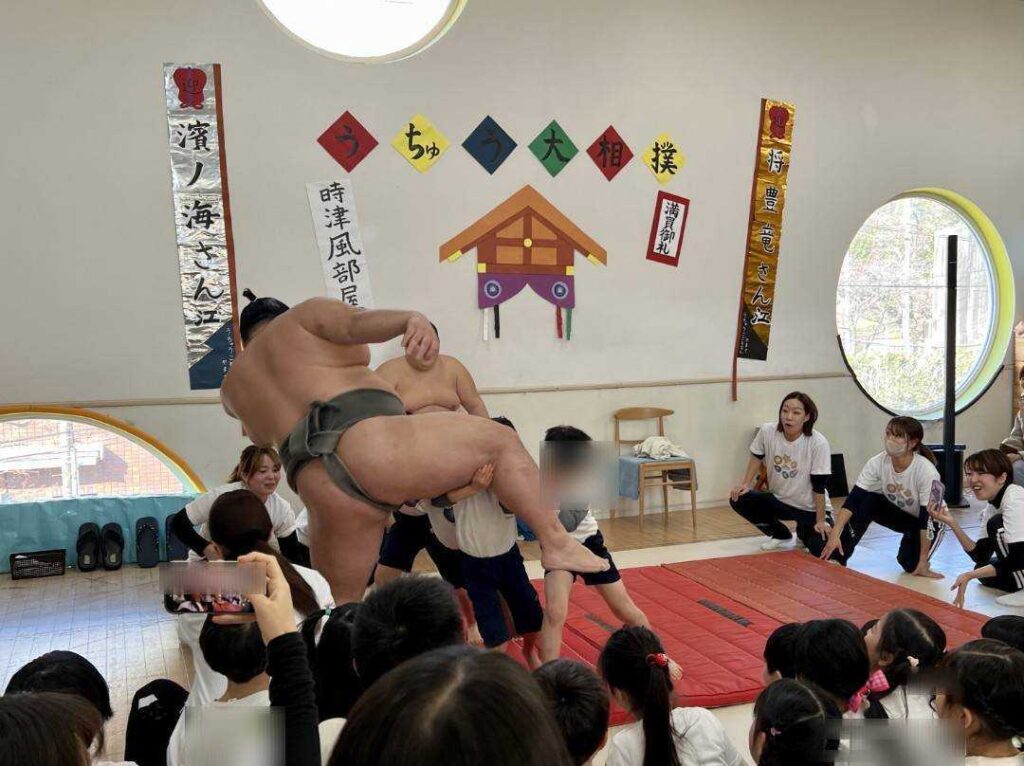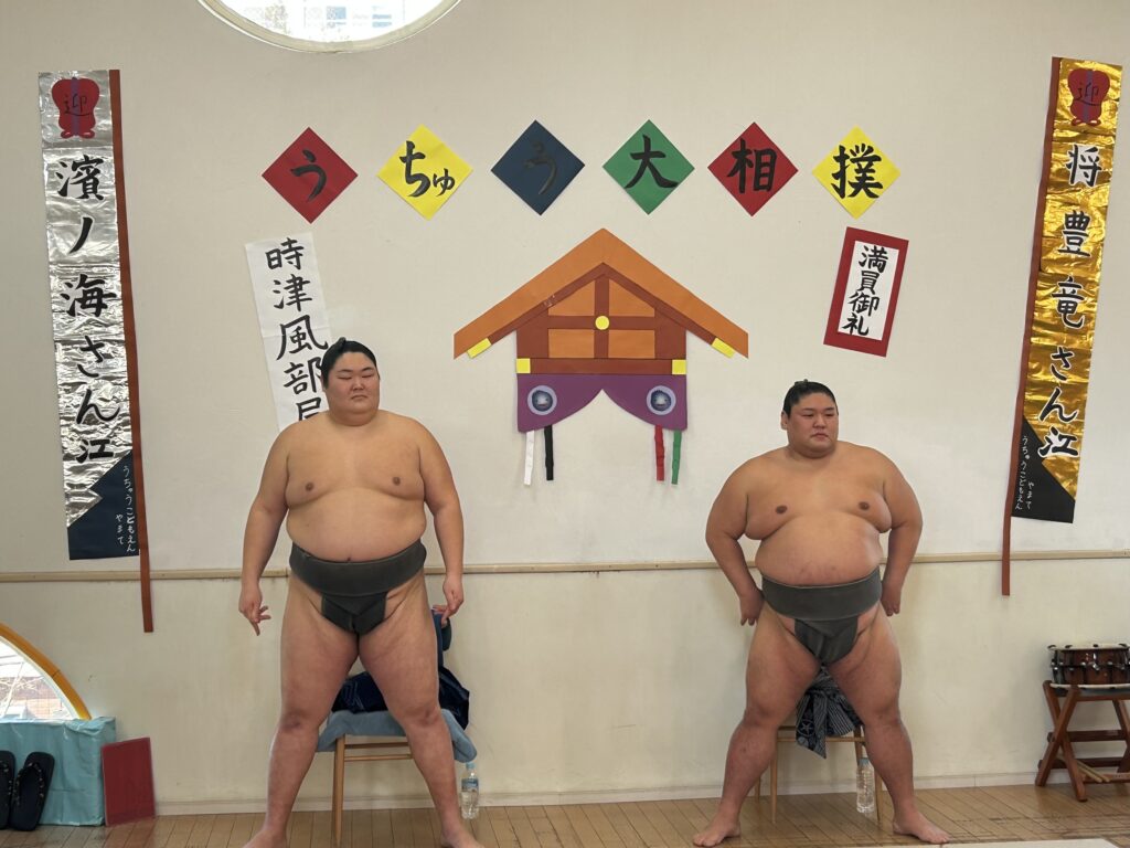 その2週間後、初場所を終えたばかりの現役のお相撲さん【時津風部屋の将豊竜さん、濱ノ海さん】に来園していただき、『お相撲さんと遊ぼう!』のイベントを開催しました!