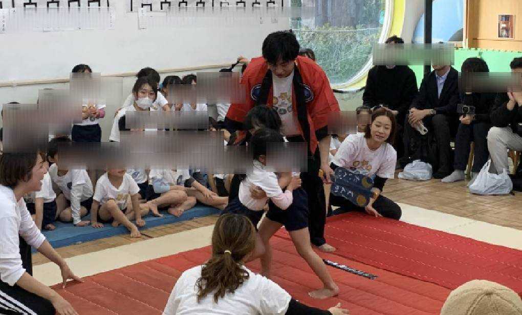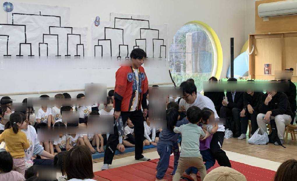 そして、幼児クラス4,5名ずつお相撲さんと取組みをさせてもらいました…が、なかなか勝つことは難しく子どもたちは顔を真っ赤にして『強い!!すごい!』と興奮していました。あるチームは『足取り』ができて見事勝利していました!