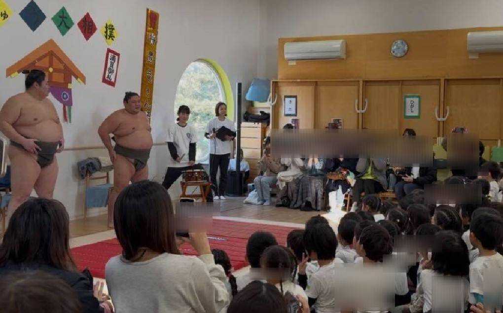 先生の打つ寄せ太鼓と共にホールに入場されると、子どもたちはお相撲さんの大きさに驚き、目を丸くして声が出ていませんでした!
