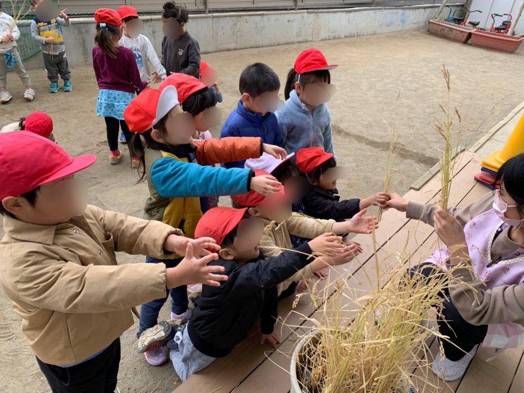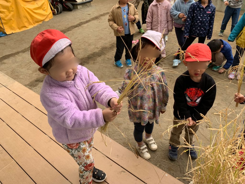 その後、幼児クラスと職員で稲刈りを行っております。1束ずつ嬉しそうに握りしめ、左右に揺らして「カサカサ」と穂と葉が重なり合う音に耳をすましておりました。