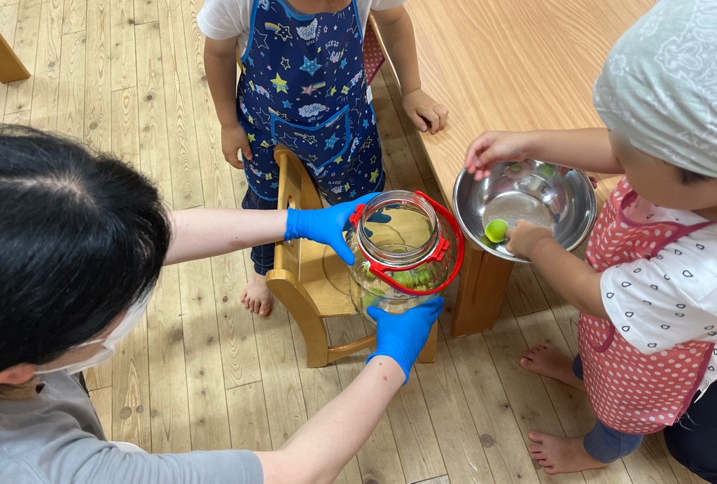 そして調理さんと担任の先生が相談をして、せっかくだからうちゅう保育園のお友達全員で梅ジュース作りをしてみようということになり…
