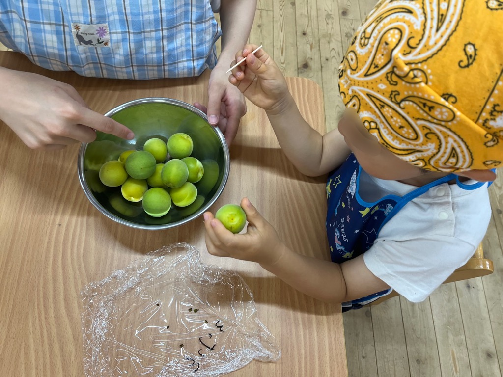 まず最初は、乳児クラスのお友達に梅を洗ってもらいました。