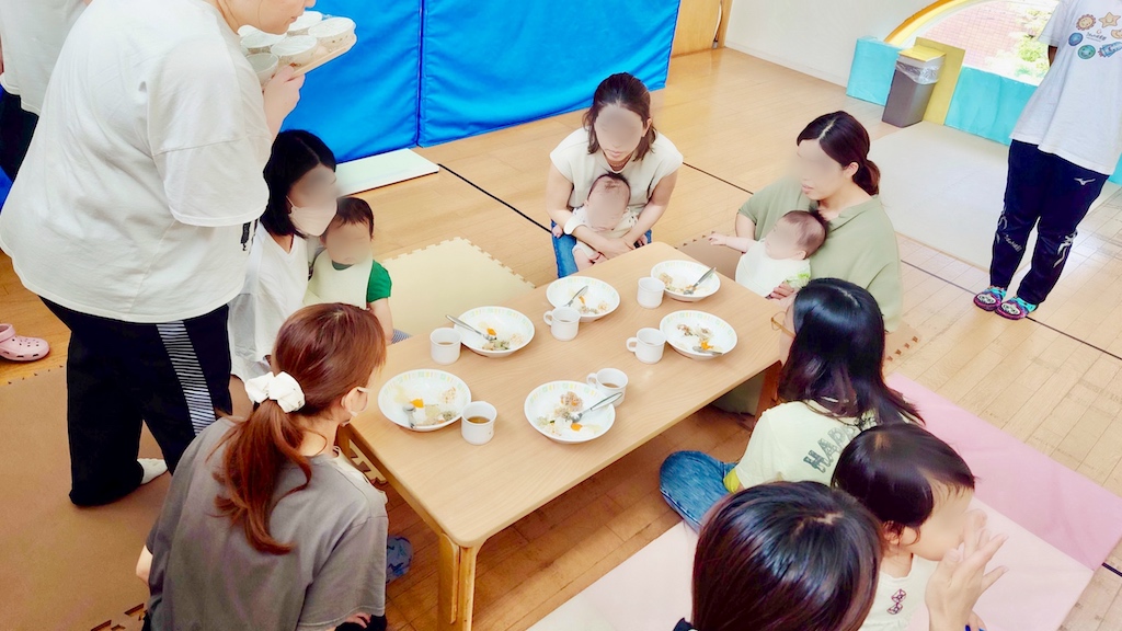 園で提供している、離乳食から幼児食まで、形態ごとに味見をしてもらいながら、栄養士から食事についてお話しをしました。