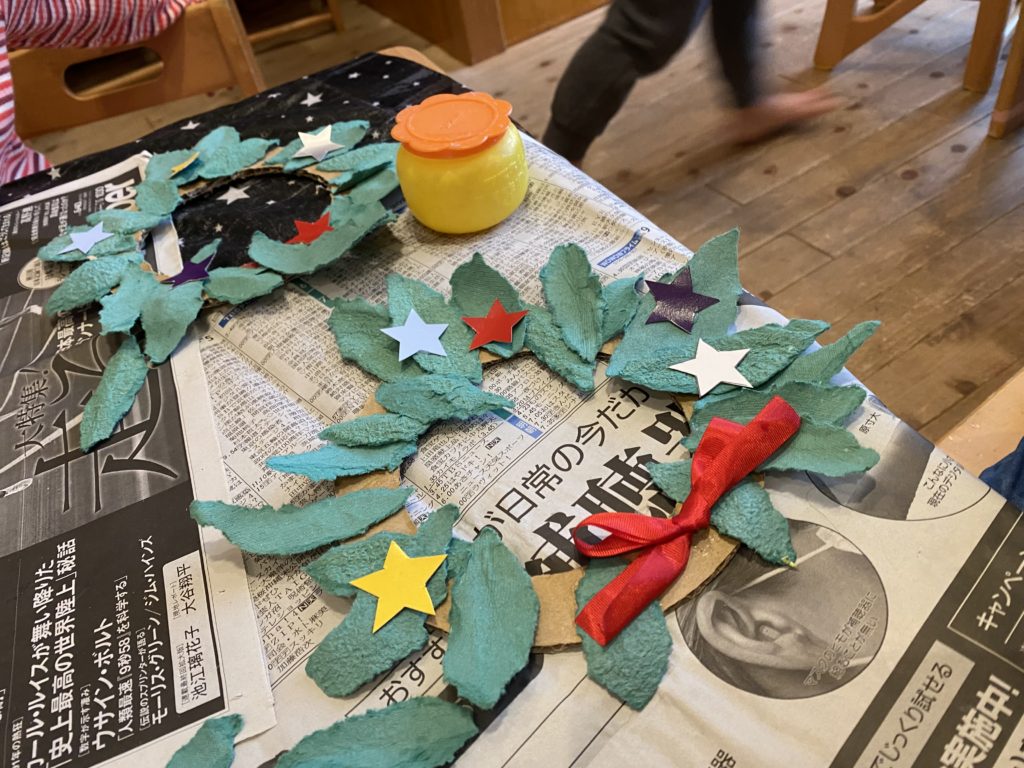 ろけっと組のお友達がりんごの緩衝材を使って、クリスマスリースを作っていました。緩衝材の貼り方がそれぞれでとても面白かったです
