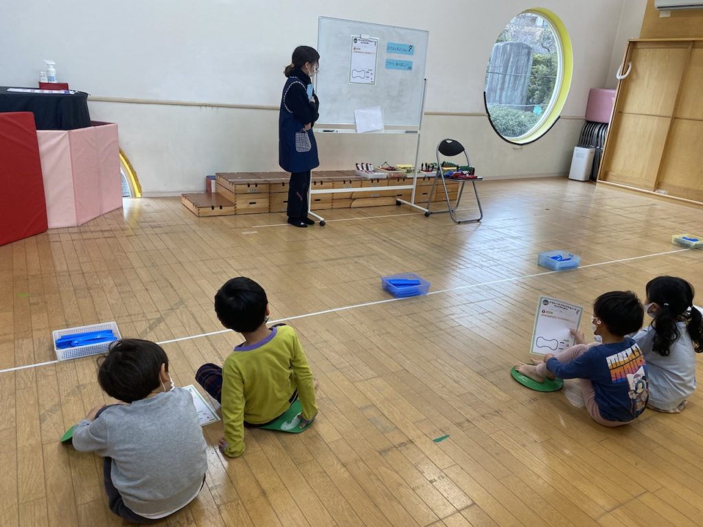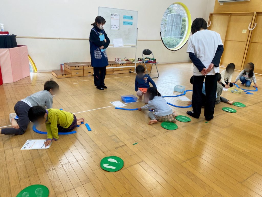 今回は、『種類の違う、16本のレールを使って、図の形を作ってみよう!』という内容でした。まず、この形が何に見えるか子どもたちに聞いたところ、全員一致で「犬のほね!」と返ってきました。