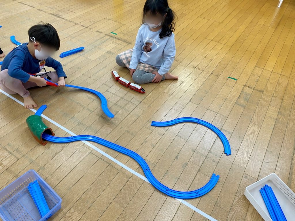 先日、5歳児クラスの子どもたちと一緒にプラレールで遊びました。目の前に置かれたプラレールに、「なんだろう?」とわくわくが止まらない様子でした。