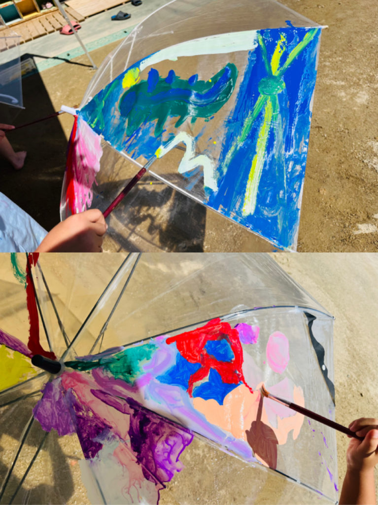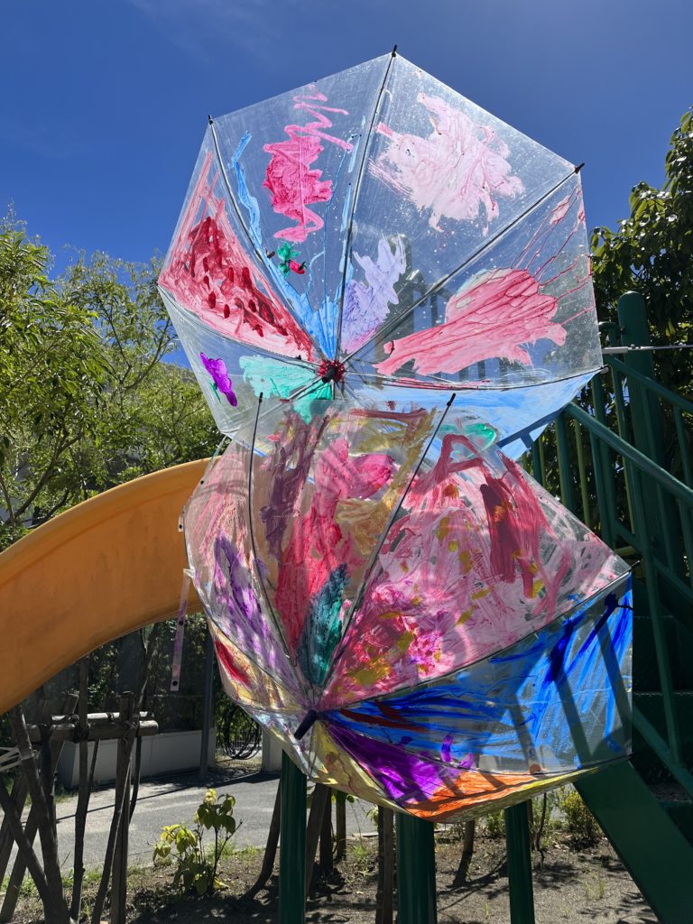 先日、ちきゅう組とうちゅう組が夏の造形として、傘のペイントを行いました。絵の具を使って、ビニール傘に自由にペイントしました。