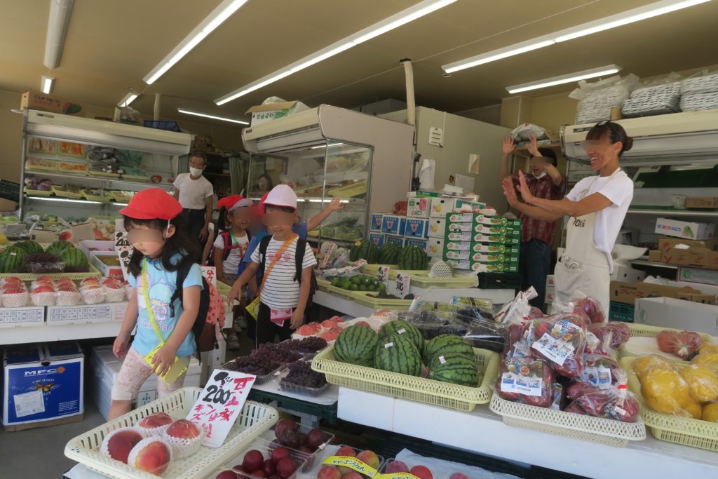 いつも給食の食材を届けていただいている八百屋さんへ、ちきゅう組のみんなでお買い物に出掛けました。お店に向かっている途中から、「上手に買えるかな!」とドキドキわくわくの様子でした!