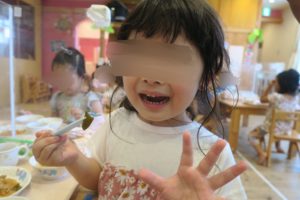 翌日のメニューは野菜たっぷりメニューです。「ピーマン食べるところ見ててね!」「僕が買ったたけのこの味どう?」とモリモリ食べました♪