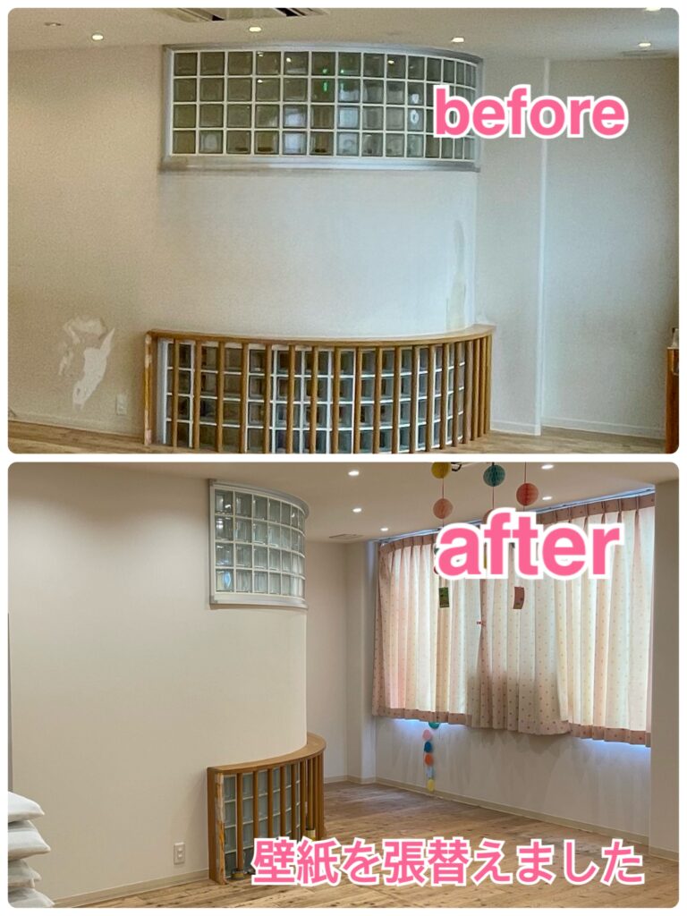 おひさま組の保育室と廊下の壁紙を新しく張り替えました。