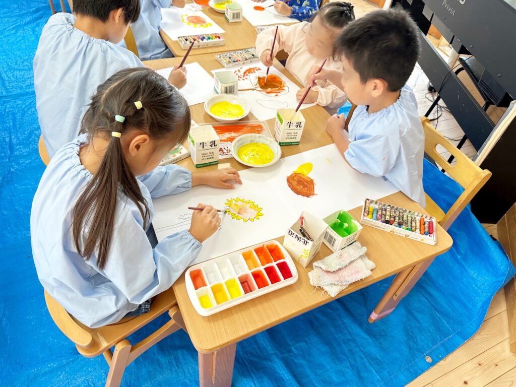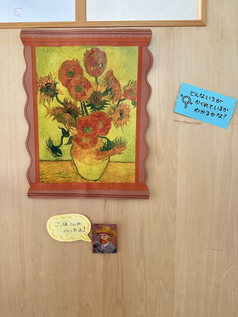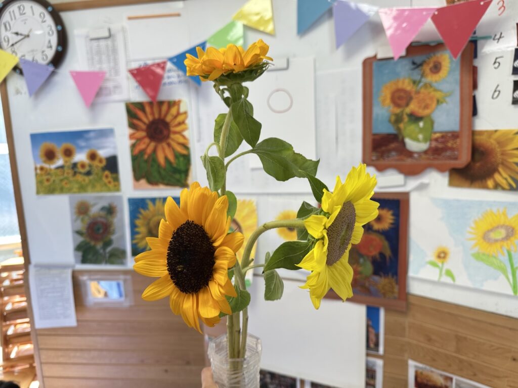 偉人の描いた『ひまわり』や先生たちが描いた『ひまわり』を見ながら過ごした1週間。描く当日には本物のひまわりを目の前に、色や形、花びらのつき方に注目しながら、のびのびと絵を描いていました。