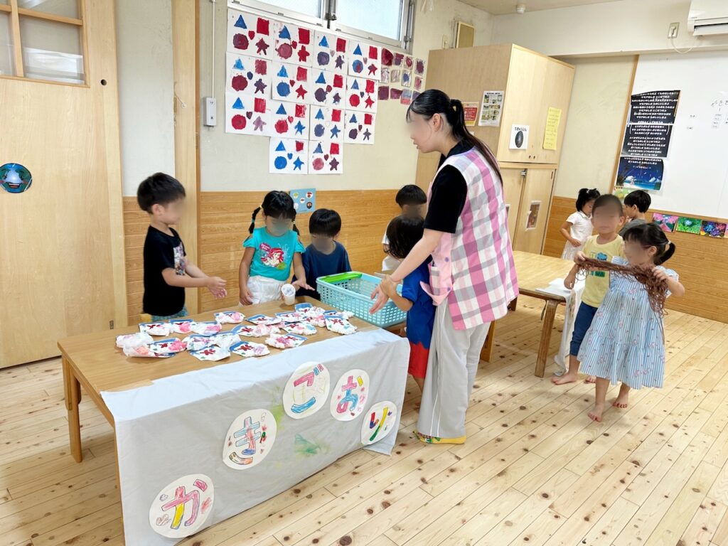 『おまつり』第二弾では、子どもたちが手作り縁日を披露!お店屋さん役とお客さん役を交代しながら、とても楽しんでいました♪