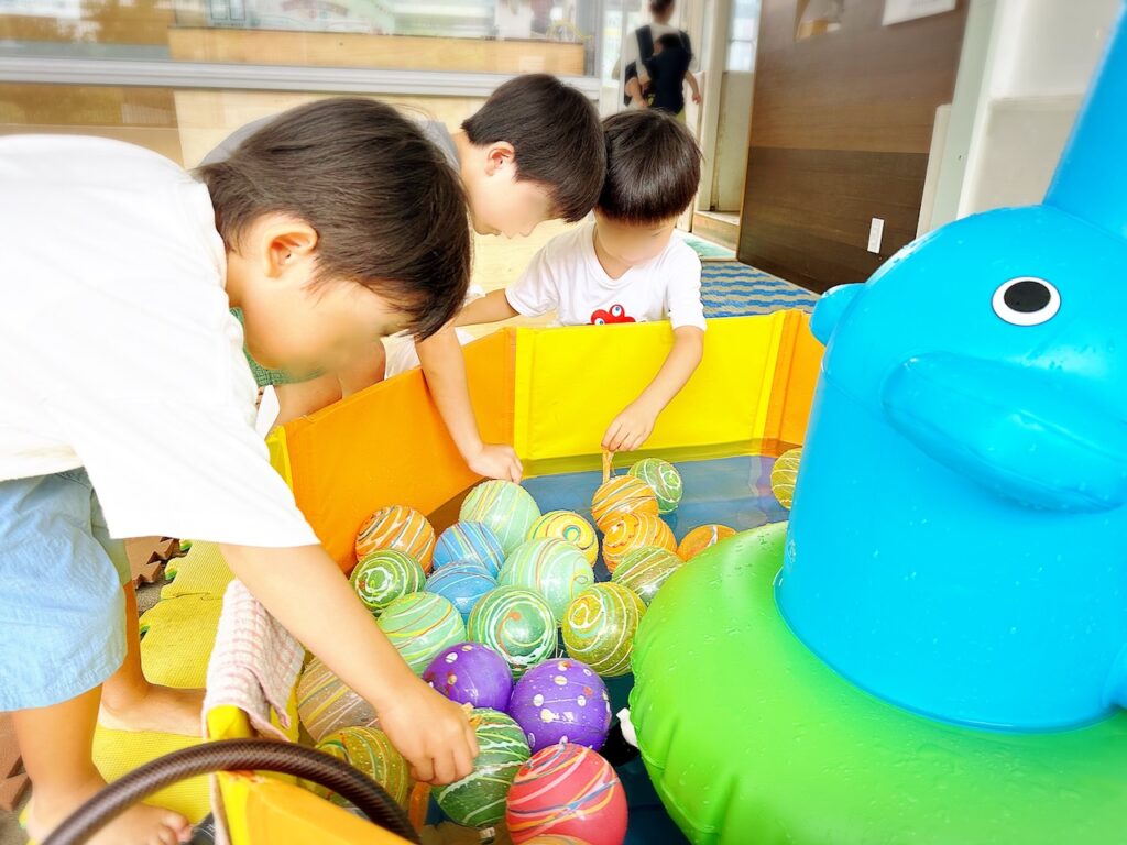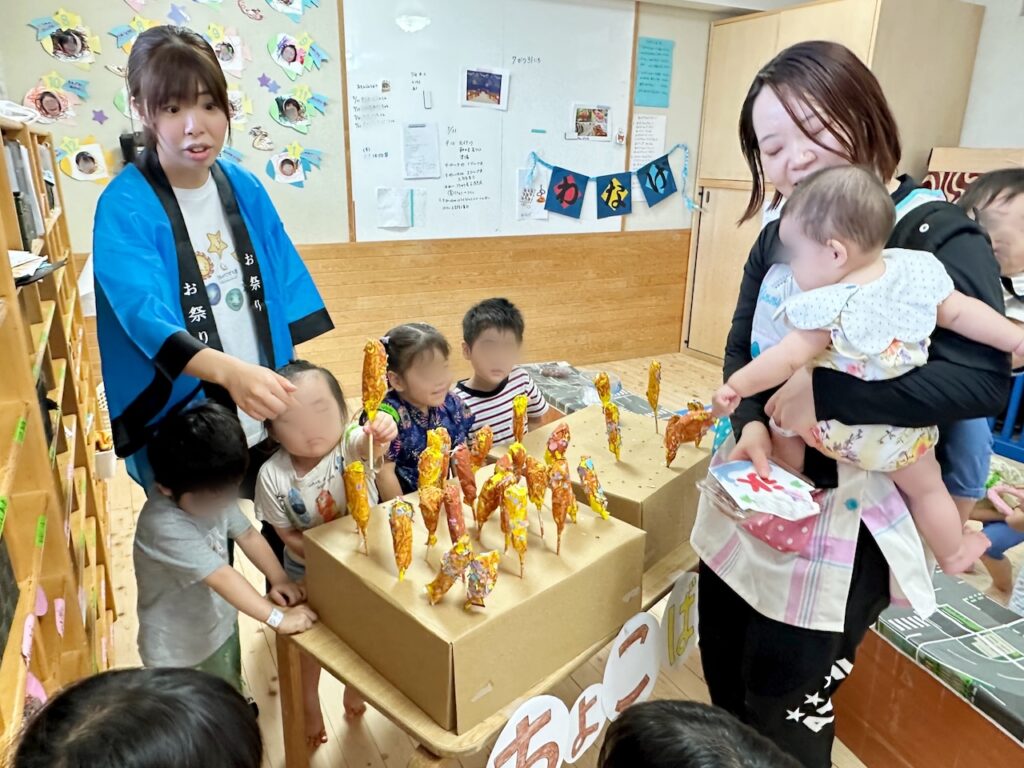 乳児クラスの子どもたちも、先生と一緒に縁日ごっこに参加し、ヨーヨーや金魚釣り、綿菓子を大事そうに持ち帰る姿がとても可愛らしかったです。