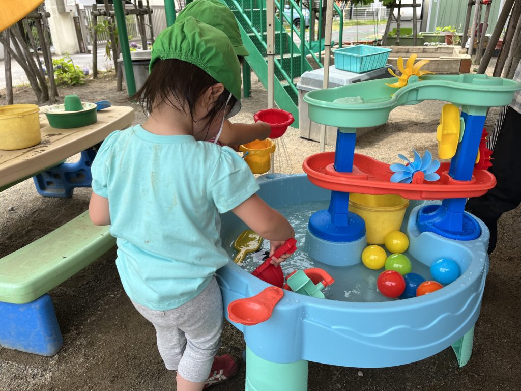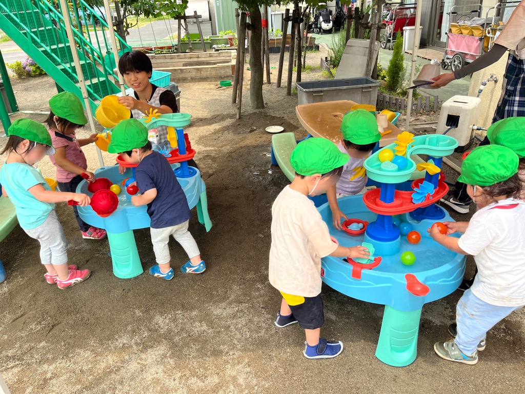 組み立ている途中からつき組のお友達が気づいてくれ、「なにしてるの?」「これなあに?使いたい!」と声をかけにきてくれました。そして遊び始めると「お魚とれたよ!」「ここくるくる回るよ!」とお話をしながら、夢中で遊んでいました。今年の夏も沢山遊びをしょうね♪