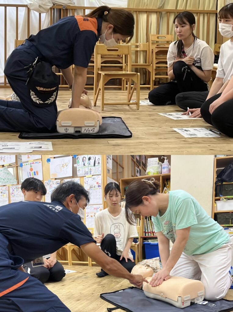 本日、中消防署の方に来園していただき、救命講習をしていただきました。昨年度も実施していただきましたが、定期的に振り返って実践していくことの大切さを痛感しました。呼吸確認、胸骨圧迫、人工呼吸、AEDの使い方だけでなく、鼻血の止血方法も詳しく教えていただきました。中消防署の方、お忙しいところ、ご指導いただき、ありがとうございました。