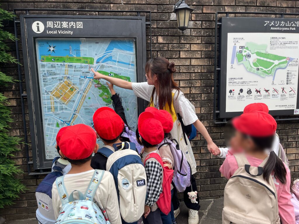 そして、うちゅう組が姉妹園のうちゅうこども園やまてまでお散歩に出かけてきました!通り道で地図を見つけて、「うちゅう保育園はここにあるよ」「今度は元町公園にいってみようよ!」「ぼくんちは、ここかな!」と盛り上がりました!うちゅう組のお友達は地図作りをするそうです。どんな地図が完成するか楽しみです。