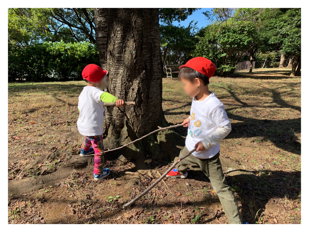 女の子たちは、枝を集めてキャンプごっこを始めました。