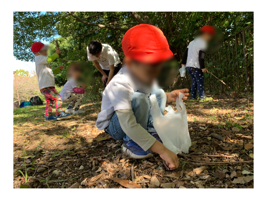 広場では、沢山のどんぐりを発見!袋いっぱいに拾い集めたり、