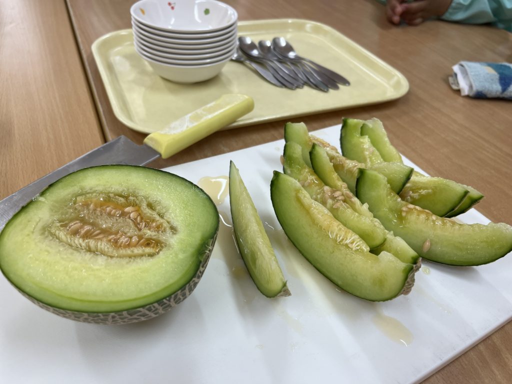 次に半分に切って、もう半分を皆んなで試食しました!切った瞬間メロンの果汁がまな板の上にでてきて「わ〜!メロンジュースでてきたぁ!」「いい匂いがする〜」と大喜び。