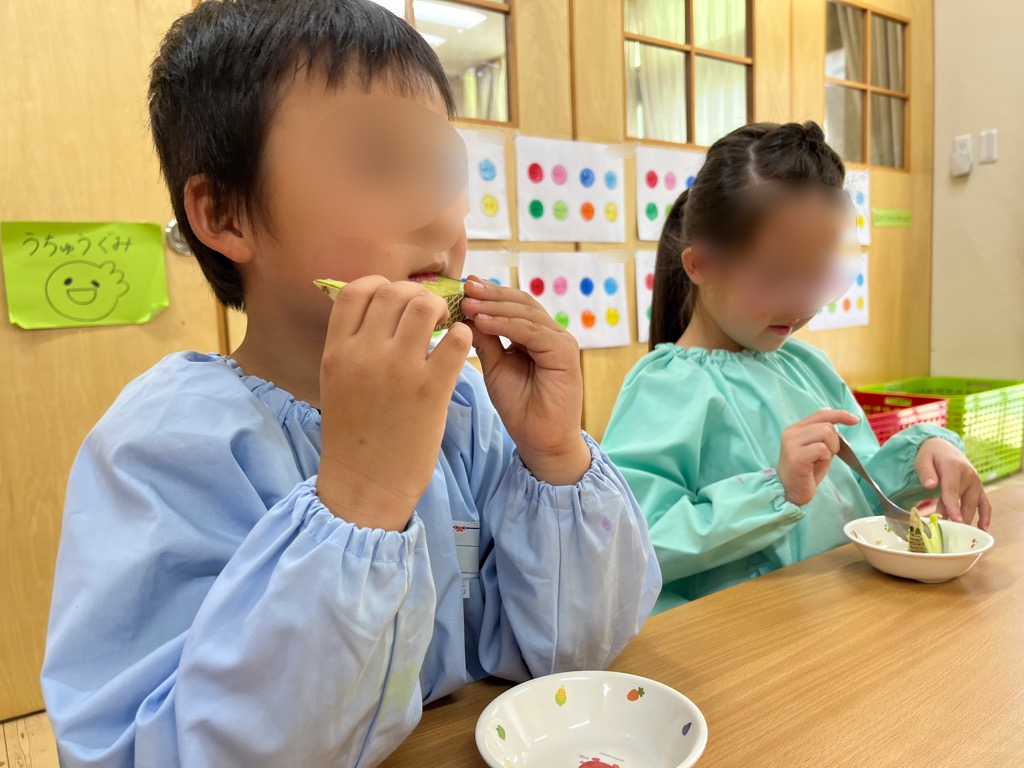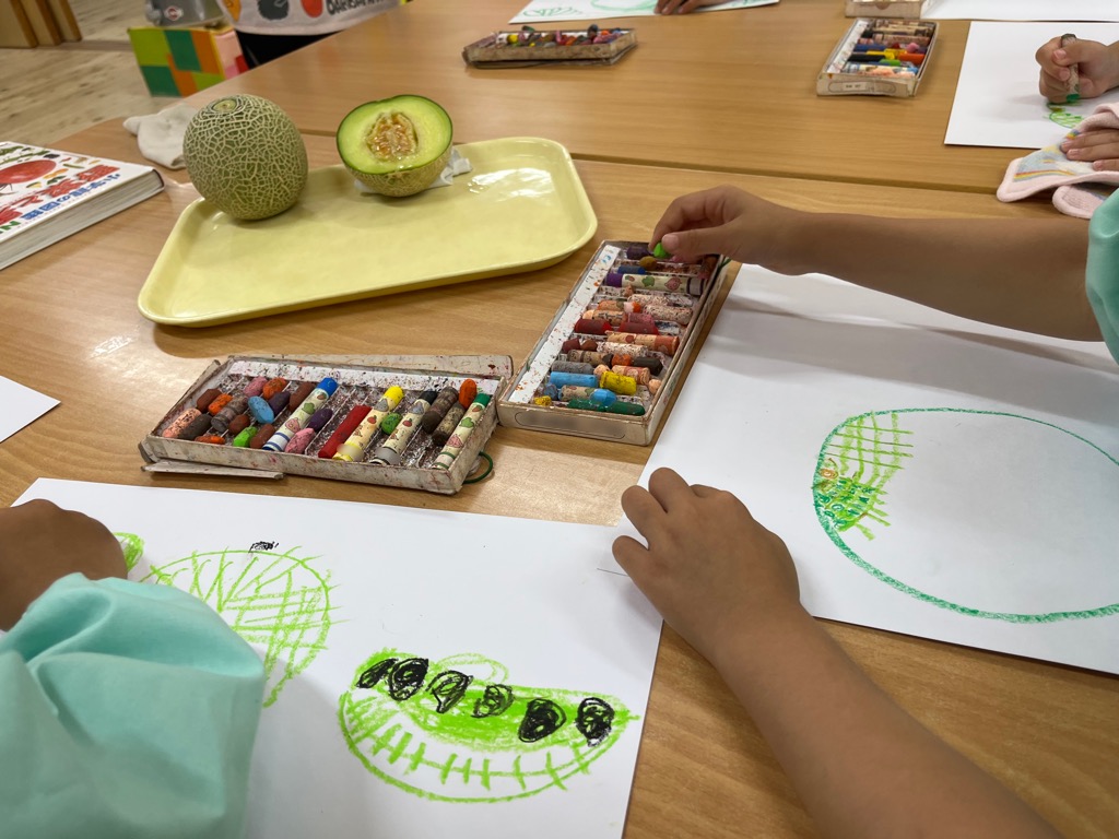 「甘い!」「美味しい!食べたから絵描く!」という声が聞こえてきて、あっという間に美味しそうなメロンの絵が完成しました🍈試食してから絵を描く流れがとても面白かったのでまたやってみたいと思います。みんなでお買い物で買ってきたお野菜や果物を写生するのも楽しそうなので計画中です。