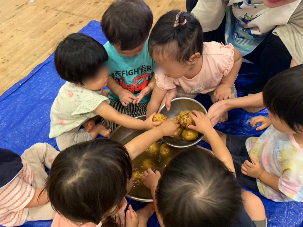 1歳児ほし組では『じゃがいも洗い』を行いました。