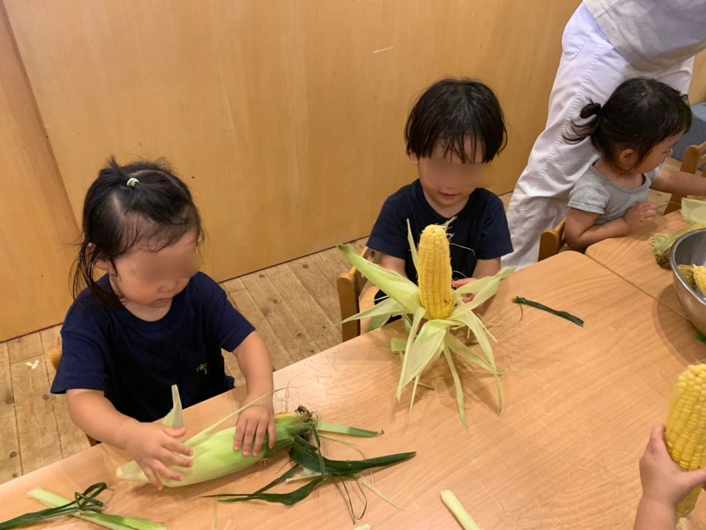 つき組2歳児は『とうもろこしの皮剥き』を行いました。